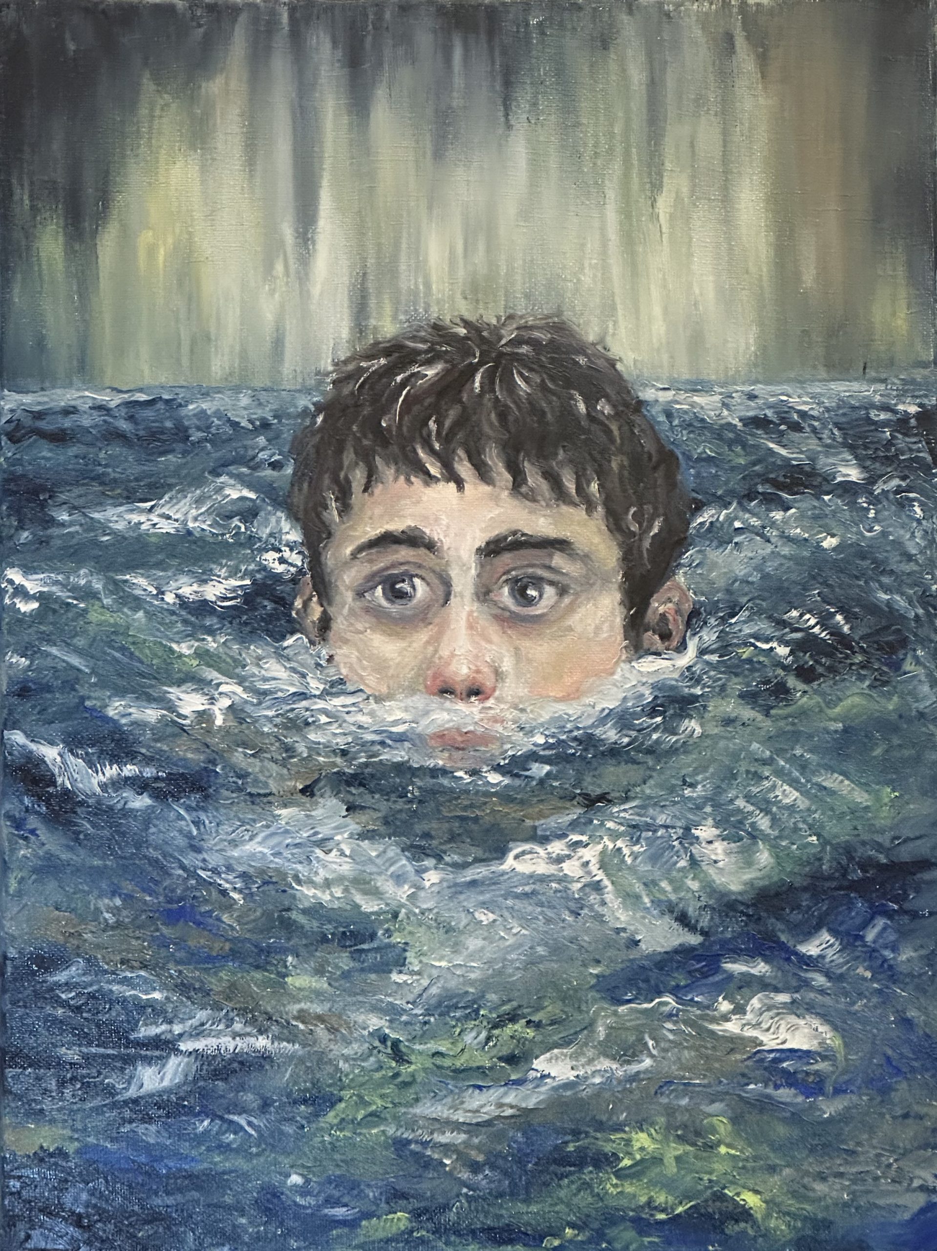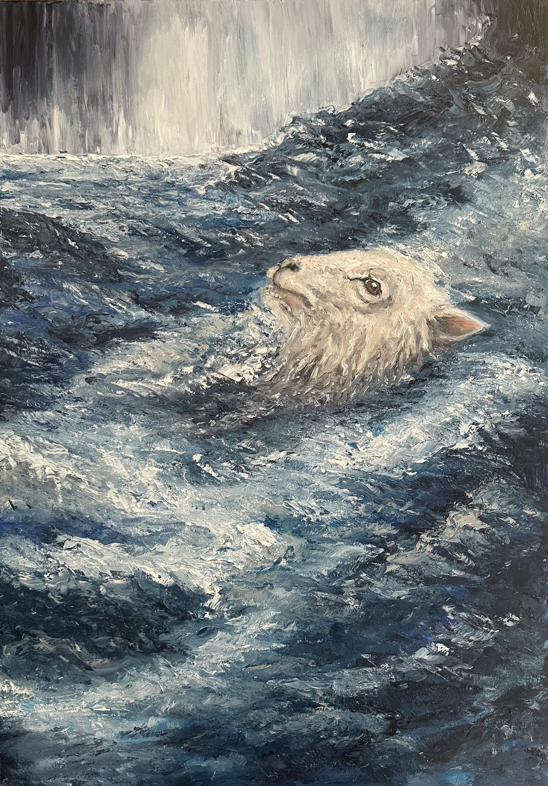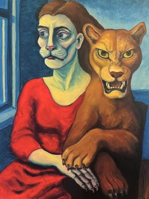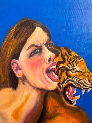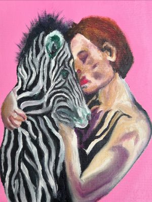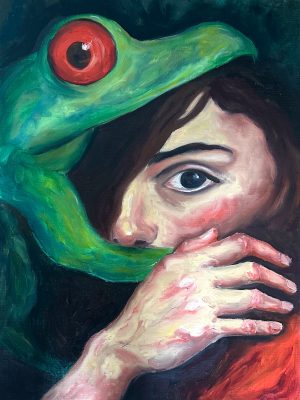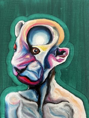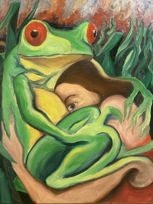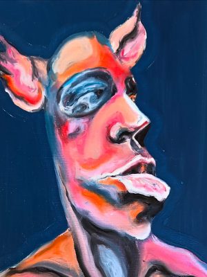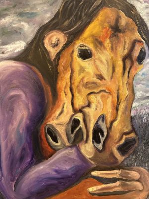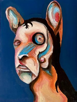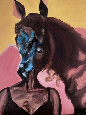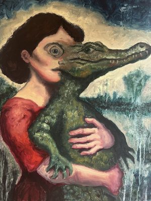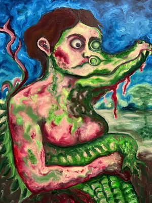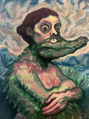 Ma peinture, expressive et colorée, puise dans la psychologie un regard sensible sur l’humain, ses métamorphoses et ses vulnérabilités. Elle explore la fusion entre l’humain et l’animal, la submersion et l’urgence climatique. Ces thématiques prennent forme à travers des figures en métamorphose, souvent féminines, saisies dans des états de tension, de fragilité ou d’hybridation.