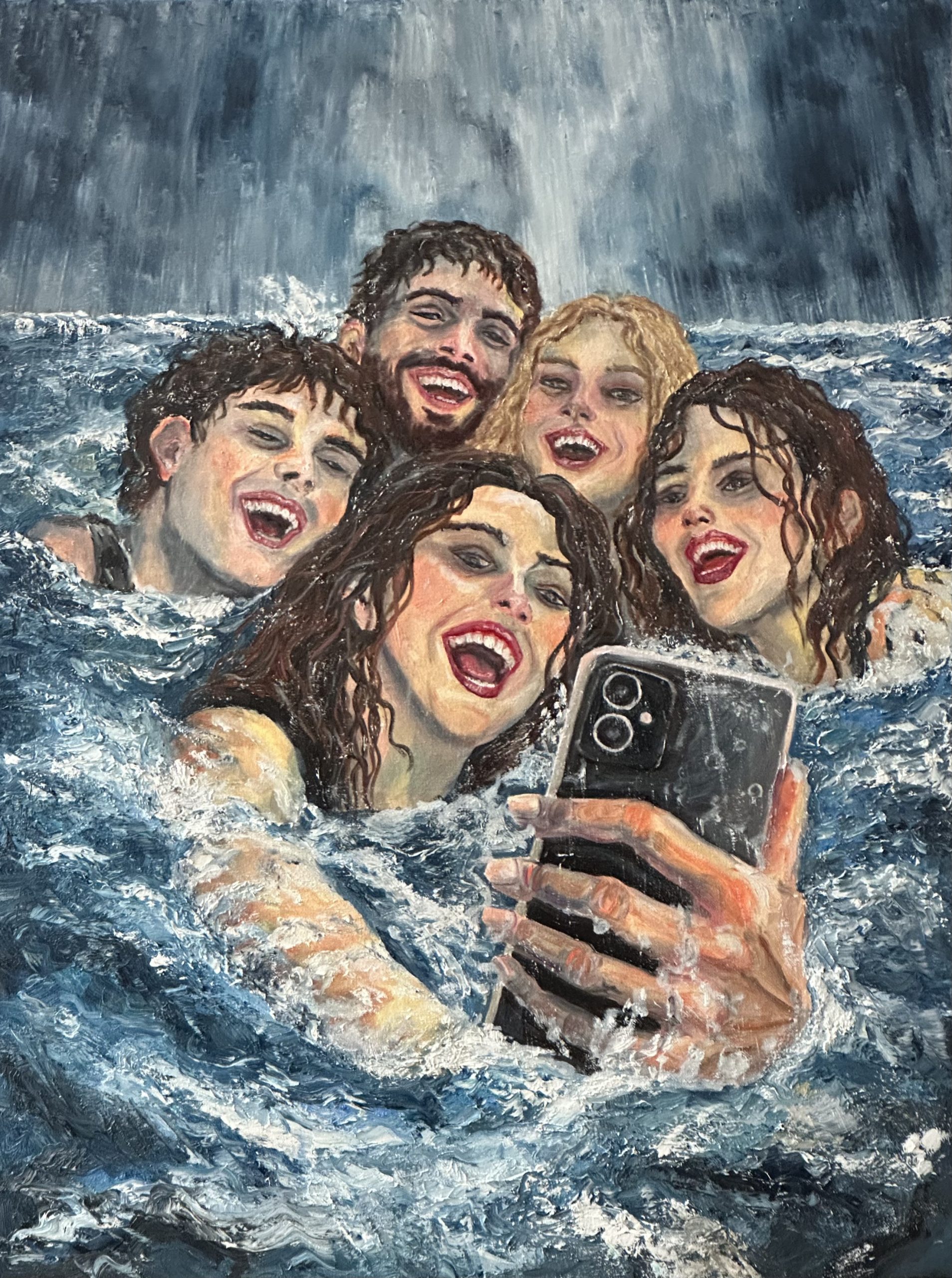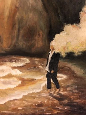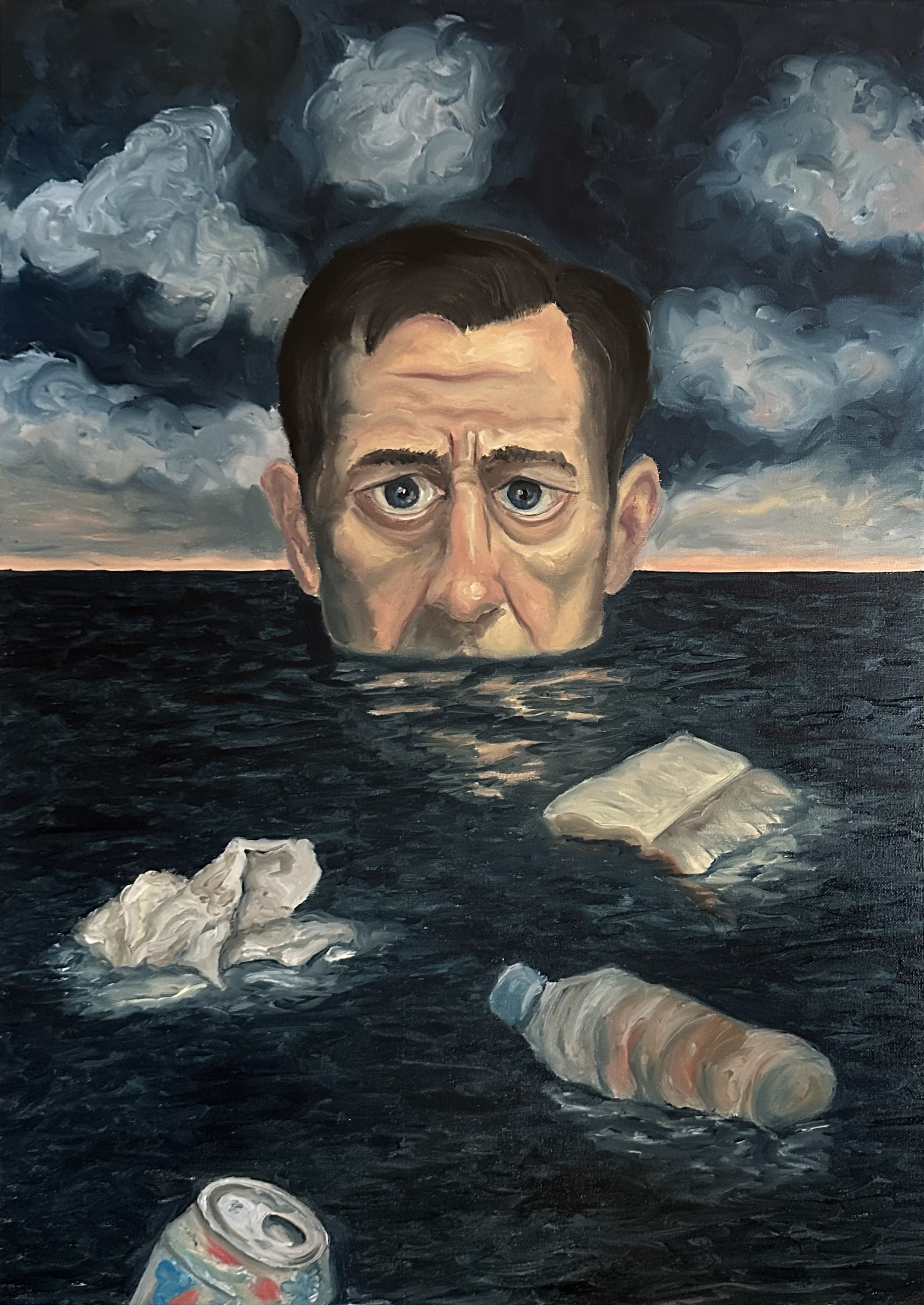 La mer, omniprésente, engloutit, déborde, charrie des déchets et reflète notre incapacité à contenir ce qui nous dépasse. Les visages peints oscillent entre résistance et vulnérabilité, témoins d’une condition humaine prise dans la marée des crises écologiques et existentielles.