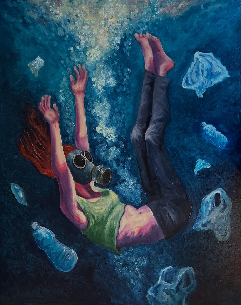 Les couleurs vives et contrastées portent une intensité expressive qui oscille entre énergie vitale et inquiétude. La submersion, récurrente dans mes toiles, évoque à la fois l’expérience intime du débordement et l’engloutissement écologique. Chaque œuvre devient ainsi un espace sensible où se révèlent nos zones de vulnérabilité et de transformation, tout en invitant le spectateur à entrer dans un imaginaire oscillant entre poésie et urgence.