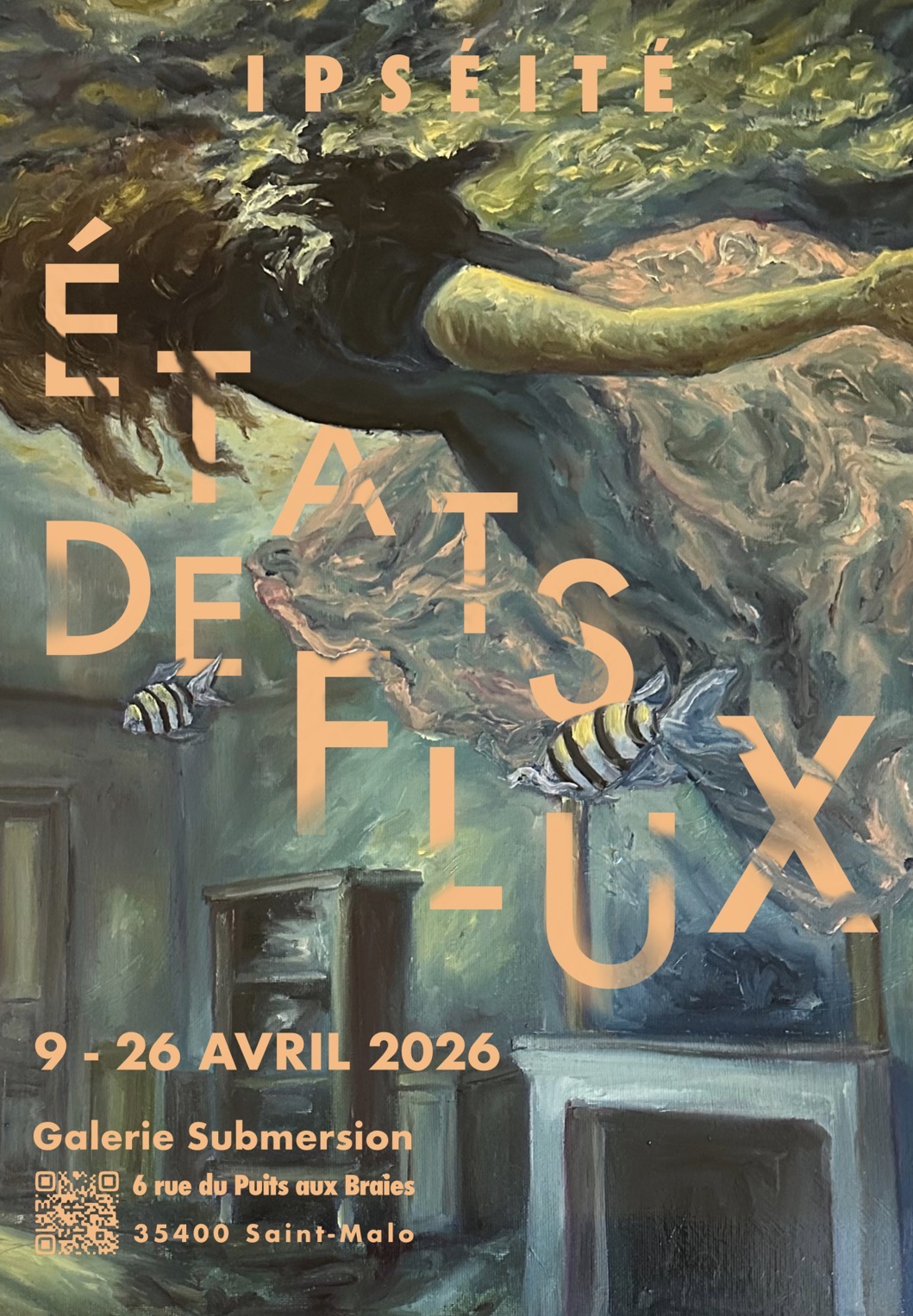 « États de flux » explore la métamorphose comme une expérience partagée entre les corps et l’environnement. Des figures humaines y apparaissent immergées dans des espaces intérieurs envahis par l’eau, ou dans des paysages en transformation. Certaines icônes de l’histoire de l’art semblent déplacées dans ces scènes instables. Les corps semblent parfois se dissoudre dans ce qui les entoure, altérés par les forces qui façonnent le monde. À travers une peinture expressive et colorée, Ipséité donne à voir des corps qui tentent de s’adapter aux bouleversements environnementaux de notre époque.